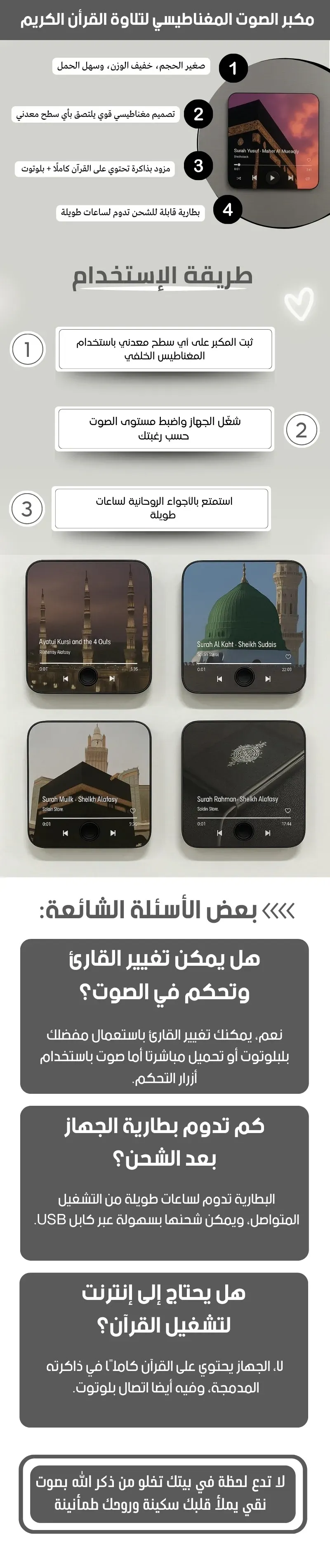 يحتوي على سور كاملة 📖 صوت واضح يملأ المكان بالخشوع 🔋 شحن سريع وعمر بطارية طويل 🧲 سهل التثبيت في أي مكان 🎁 مثالي كهدية مباركة